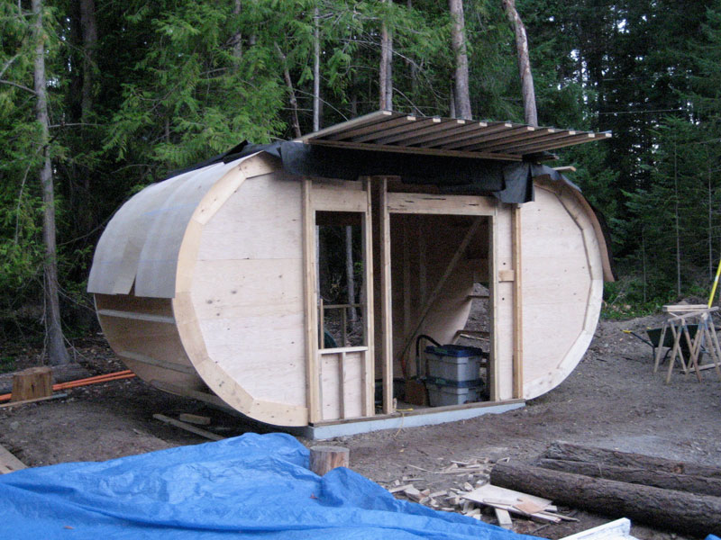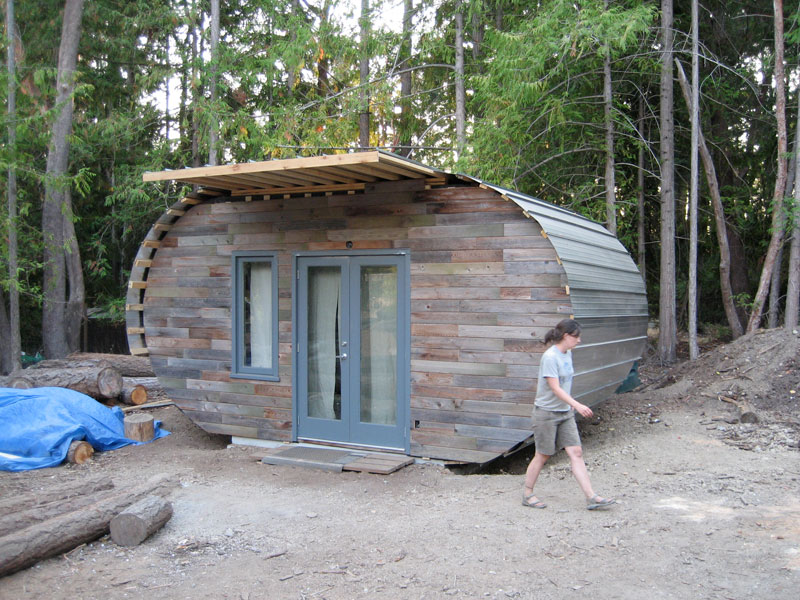 This 10'x10' one-room shed is designed to look like the campers that are often built on the Gulf Islands as a first step to building a home. The two sides have been bayed out to double the interior space, and since these semi-circles act as deep beams, the space inside is free to configure.